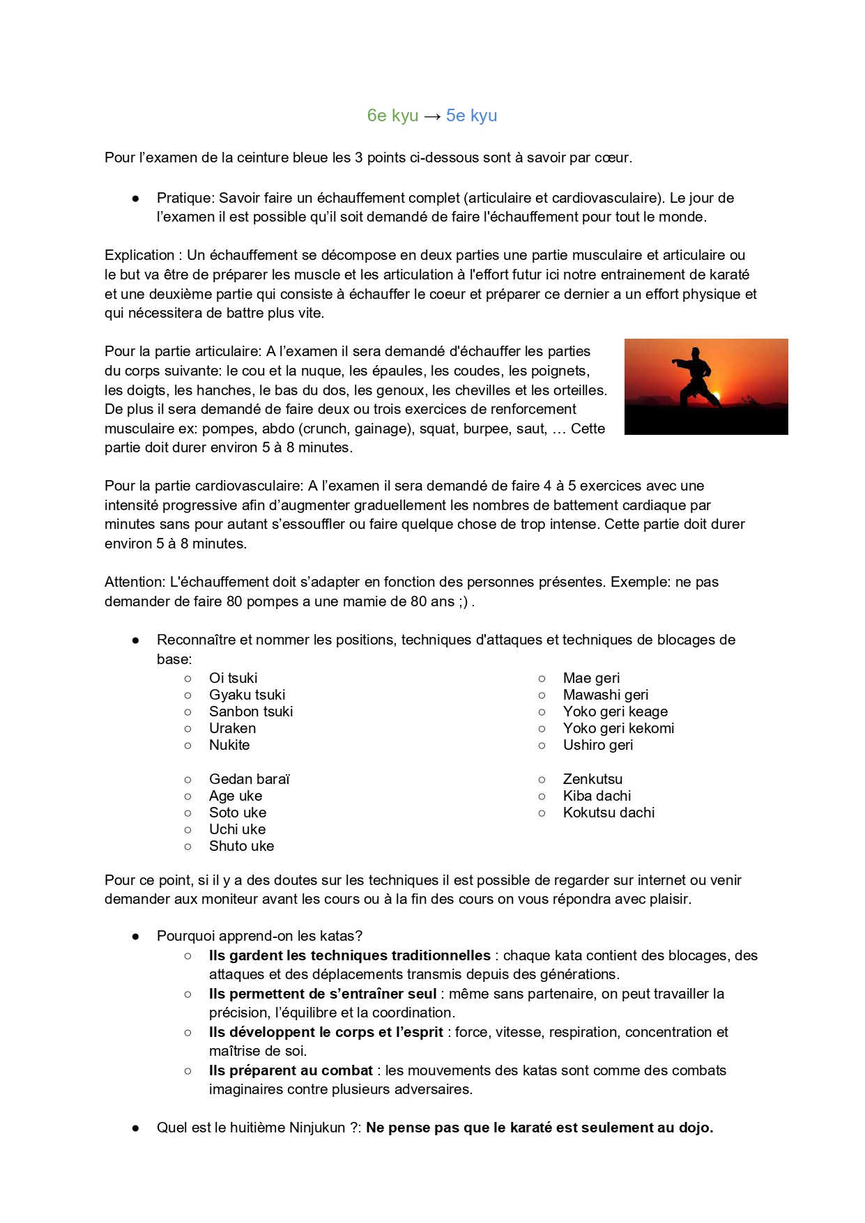 Pour passer la ceinture bleue, il faut répéter les mouvements suivants cinq fois de suite, en avançant, puis en reculant. Au cinquième mouvement, il est nécessaire de faire un Kiai.